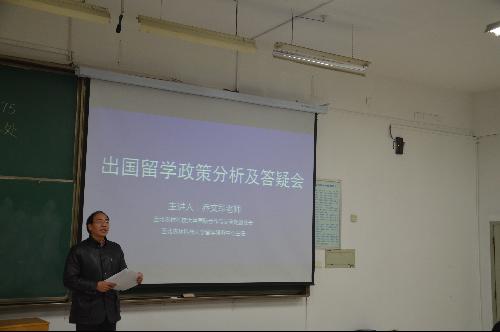 3月6日晚,出国留学政策分析及答疑会在北校8号教学楼8T08举行。国际合作与交流中心副处长、留学服务中心主任乔文军老师为全校近两百名同学介绍了出国留学的有关政策,并针对同学们提出的问题做了详细解答。